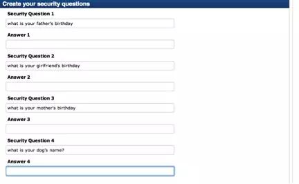 3. 之后会出现登录问题,这个页面里面大家填写的所有问题答案一定要牢牢记住。因为每一次的登录,都会被要求回答上面问题中的某个问题,作为安全测试。