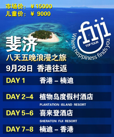 您的位置:吾爱首页 > 旅游资讯 > 【绝美岛国斐济8天5晚酒店+机票】特价:10月5日后 仅1万元,儿童5折