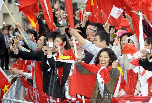 4月26日,群众沿途欢迎奥运圣火。当日,北京奥运会圣火传递活动在日本长野举行。这是北京奥运会圣火境外传递的第十六站。