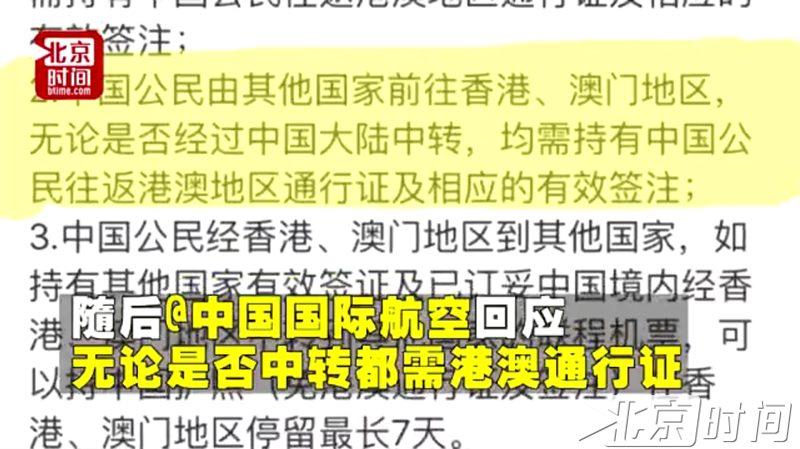 国航次日发表声明回应称:中国公民由其他国家前往香港、澳门地区,无论是否经过中国大陆中转,均需持有中国公民往返港澳地区通行证及相应的有效签注。