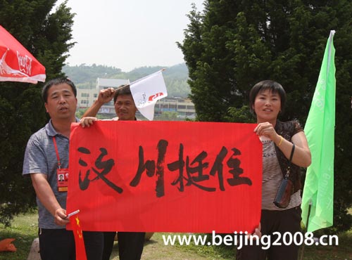 在传递路线沿途,记者看到,老区人民不仅关心奥运,更心系四川灾区人民。有人在沿途打出“汶川挺住”标语,支持灾区人民。